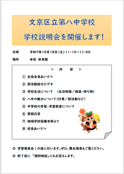 以下に、文京区立第八中学校部活動公開のお知らせを再掲いたしますので、詳細をご覧ください。