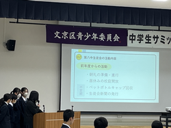 12月6日(土)に文京区民センターにて、第62回中学生サミット連絡会が開かれました。本校を含め、新しい生徒会役員になってから初めての会議となりました。各テーブルに座ったメンバーの共通点を探すアイスブレイクで緊張をほぐし、そこから各学校の取り組みを紹介しました。八中はペットボトルキャップの回収などの説明をしました。そして、来年7月に予定されている第63回の議題内容を審議しました。各中学校の生徒と交流を深められた、良い時間となりました。