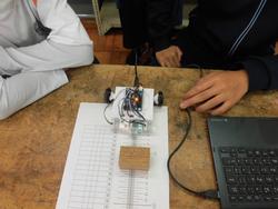 ICT研究授業 「マルチプログラムカーを用いた自動ブレーキシステムの制作」 2年B組の技術の授業では、対象物までの距離を測る赤外線フォトリフレクタを使い、車にブレーキをかけるプログラミングを行いました。この技術は、車間距離制御にも使われているものです。生徒は処理の手順を班で話し合いながら、協力して粘り強く取り組んでいました。(3/4 15:08更新) |