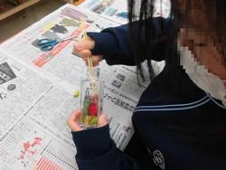 ハーバリウム 3年生は、卒業記念として美術でハーバリウムを作りました。生徒からは、「綺麗に作れて嬉しかった」「花を入れるのが難しかった」などの感想が。美術科のH先生からは、「同じ材料を使いながら、それぞれが違った表現ができていました。また、保護者の方へ感謝の想いを届けるために、大変丁寧に作っていました」とのことでした。素敵にできましたね。(3/13 11:45更新) |
