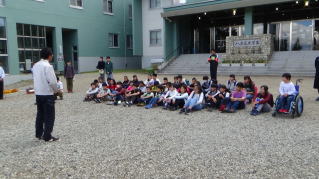 | 校庭に集合 | 出発式 | 学校からバスまで移動 |