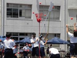 BTSも溶かす熱血玉入れ 3年生の学年種目は、「BTSも溶かす熱血玉入れ」です。「B」…妨害玉入れ、「T」…玉入れ鬼ごっこ、「S」…シンプル玉入れという3種目で争います。妨害玉入れは、長い棒の先についた板で球が入るのを妨害します。玉入れ鬼ごっこは、籠を背負った人が、逃げ回ります。シンプル玉入れは、コントロール良くたくさん入れられるかが見所です。去年の「愛のラケット便」以上に、良いチームワークが見せられるように頑張ります。お楽しみに!(3年生より)(6/1 14:48更新) |
