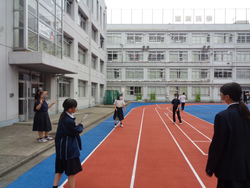 リレーの練習 4限目、1年A組の保健体育はリレーの練習。まず最初はしっかりと準備体操、その後熱中症にならないように給水をしてから、1年B組とのエアー対戦。目標はB組の記録である7分11秒を超えることでした。バトンが上手に渡されると拍手が起きることも。まだまだ練習が必要ですが、さわやかな5月の空のもと、生徒の明るい声が校庭に響き渡っていました。(5/25 12:26更新) |