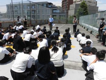 避難訓練 今日は水害を想定した避難訓練をしました。梅雨や台風などの集中豪雨のときに、適切な判断と迅速な行動ができるようになるためです。じりじりと照り付ける梅雨明けの太陽のもと、初めて屋上に避難しました。被害が想定されるエリアや避難する場所などを表示したハザードマッツをよく確認しておきましょう。(6/27 12:59更新) |