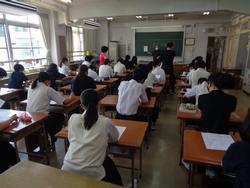 いのちと心の授業 9日(土)は、授業公開とともにいのちと心の授業を行い、助産師、医師、JICAの方からお話をうかがいました。このうち、1年生は助産師の板橋先生からのお話。先生からは、人が生をうけ生まれる確率の低さ、無事に生まれてくるまでの親の気持ち、悩みの多い第二次性徴のことなど、生と性の話をしていただきました。生徒からは、助産師免許の取り方や大変なことなど多くの質問がでました。しっかりと話を聞き、どんどん質問できる素晴らしい1年生です。(7/9 10:20更新) |