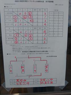 ソフトテニス部 女子団体 準優勝 9月22日(日)、文京区立第九中学校において、ソフトテニス部の女子団体戦が行われました。当日は雨が降ったり止んだりの天候でした。 午前中は4校によるリーグ戦、午後は勝ち上がりの決勝トーナメントです。リーグ戦は各選手がこれまでの練習の成果を発揮し、順調に勝利していきました。 午後の決勝トーナメント準決勝で跡見学園中学校に1番手④-0、2番手④-0で勝利し、都大会出場を決定しました。決勝戦は茗台中学校との対戦でしたが、1番手0-4、2番手0-4で敗退しました。 結果は準優勝です。11月の都大会出場は決定しましたが、まだまだ技術面、精神面で課題が残る大会となりました。これからの1ヶ月半で、さらなるレベルアップを図り、都大会上位を狙っていきます。