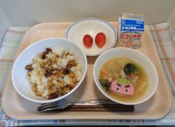 2月3日(火)節分献立:節分ご飯、具沢山みそ汁、果物、牛乳