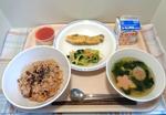 赤飯、ホキのあずま煮、野菜の甘酢和え、すまし汁、ミルクゼリー苺ソース、牛乳