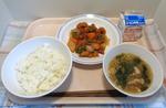 ご飯、酢鶏、豚もやしスープ、牛乳