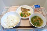 ご飯、鯖の味噌煮、野菜のこぎつね和え、沢煮椀、牛乳