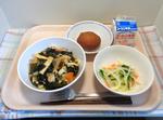 わかめうどん、千切りポテトサラダ、おからドーナッツ、牛乳