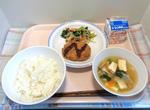 ご飯、手作りコロッケ、野菜とじゃこの和え物、味噌けんちん汁、牛乳