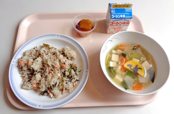 10月6日のメニューは、鮭ひじきご飯、秋の里すまし汁、お月見団子、牛乳でした。文京区では和食に親しむよう、月に1回「和食の日」を実施しています。