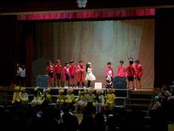 1年生の「おたまじゃくしの101ちゃん」では、おたまじゃくしのお母さんが、迷子になった101ちゃんを探しに行き、色々な池の生き物と出会っていく物語を、1年生113名で演じました。全ての体験が初めてとなる中で、一つ一つの台詞や動きを練習し、精一杯やり切りました。お互いに助け合いながら一つの舞台を作り上げられたことを、嬉しく思います。
