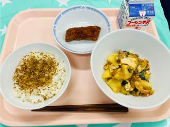 牛乳・麦ごはん・カレーごま・いかのから揚げ・生揚げのうま煮