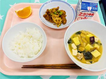 牛乳・ごはん・チキンチキンれんこん・さつまいものみそ汁・果物(夢オレンジ)
