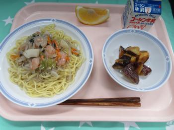 牛乳・あんかけ焼きそば・大学芋・河内晩柑