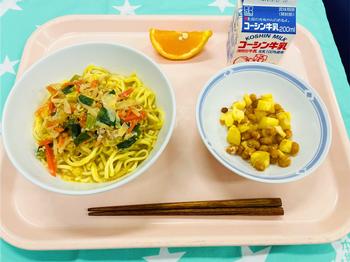 牛乳・豆乳みそラーメン・ガーリックビーンズ・果物(でこぽん)