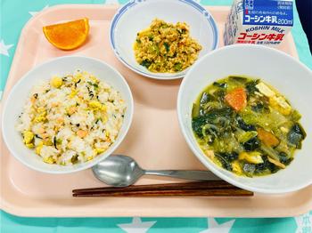 牛乳・鮭と玉子の春風ごはん・炒り豆腐・春わかめのみそ汁・果物(甘平)