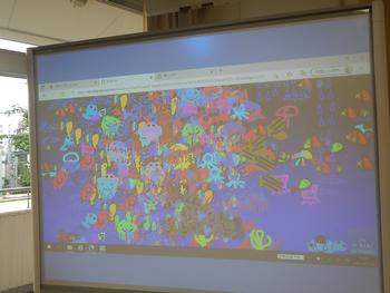 二年生がタブレット端末を使用したプログラミング学習を行いました。プログラミングソフト「ビスケット」を使って「スイミー」の世界をイメージして海の生き物の絵を描き、動きを付けました。自分たちが描いた海の生き物が動き、大画面に映し出され、子供たちはとても喜んでいました。