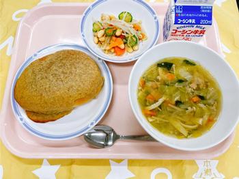 【姿勢よく食べよう】 牛乳・黒砂糖パン・ポテトグラタン・野菜スープ・果物(みかん) 今月の給食目標は「正しい姿勢で食べよう」です。「背筋を伸ばし、足は床にぺたんとつけること」「食具を持たないほうの手は、食器を持つか、食器が大きいときは添えるようにすること」を伝えました。姿勢に気を付けて、マナーよく食事ができるようになってほしいと思います。 |