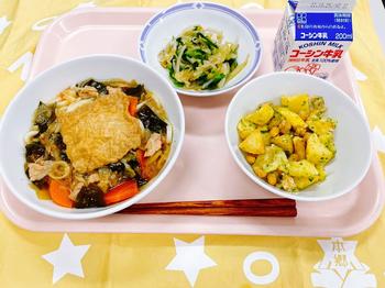 【きつねうどん】 牛乳・きつねうどん・からしあえ・大豆とじゃがいもの青のり揚げ かつて天下の台所と言われた大阪で、別添えで出された油揚げをお客さんがうどんに乗せて食べたのが、きつねうどんのはじまりという説があります。きょうは、410枚の油揚げを切り、うどんのつゆとは別の釜でコトコトと甘く煮つけ、給食室特製きつねうどんを作りました。 |