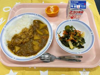 【食前・食後のあいさつをしよう】 牛乳・カレーライス・海藻サラダ・果物(みかん) 今月の給食目標は、「給食の大切さを知ろう」です。食べ物や、料理を作ってくれた人への感謝の気持ちを表す方法として「いただきます」「ごちそうさま」があることを伝えました。 |