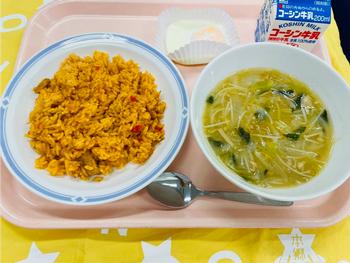 【キムタクごはん】 牛乳・キムタクごはん・春巻き・わかめスープ キムタクごはんは、長野県発祥のメニューです。漬物文化が発達していながら、子供たちの漬物離れが進んでいたことを受けて考案されたそうです。キムチとたくあんをベーコン、豚肉と炒め合わせ、ごはんに混ぜ込んで作りました。 ★本日の地場産物★ 小松菜 |