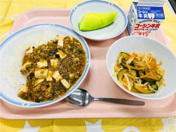 【糸寒天】 牛乳・麻婆豆腐丼・糸寒天サラダ・果物(メロン) 糸寒天は、寒天を細く切って凍結乾燥させた食品です。食物繊維が豊富で、おなかの調子を整える働きがあります。きょうは、糸寒天を使って、サラダを作りました。 ★本日の地場産物★ きゅうり |