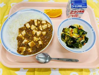 【豆腐】 牛乳・麻婆豆腐丼・わかめサラダ・果物(ネーブル) 豆腐は、大豆からできる食品で、カルシウムやたんぱく質が豊富に含まれています。きょうは、豆腐を全校分80㎏使って、麻婆豆腐を作りました。豆腐は、一度下茹でしてから、炒めた具と合わせることで、加熱不足や煮崩れを防いでいます。 |