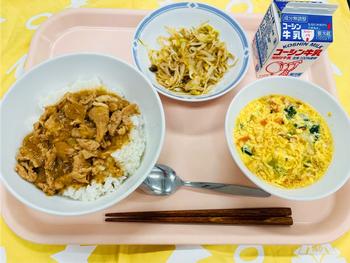 【本郷小 カレー】 牛乳・カレーライス・海藻サラダ・フルーツヨーグルト 本郷小のカレーは、ルウから手作りです。 調理師が油と小麦粉、カレー粉をじっくり炒めて作ります。たっぷりのあめ色たまねぎを加えるのもこだわりです。 |
