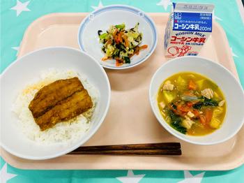 さんま 牛乳・さんまのかばやき丼・のり和え・鶏肉とさつまいものみそ汁 きょうは、給食室でさんまを揚げて甘辛いたれをからめ、ご飯に乗せて、さんまのかばやき丼を作りました。 さんまは、漢字で「秋刀魚」と書く、秋が旬の魚です。 じょうぶな骨をつくるビタミンDや、血液をサラサラにするDHAなどの栄養素が多く含まれています。 濃いめのたれが絡んださんまはごはんによく合い、子ども達もおいしく食べていた様子でした。 |