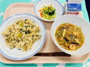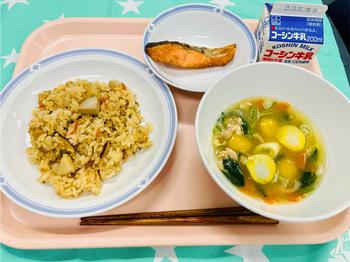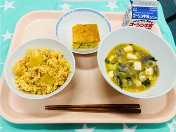 十五夜 牛乳・里いもごはん・鮭のゆず風味焼き・お月見白玉汁 旧暦では8月15日であるきょうは中秋の名月、特別な十五夜です。 収穫した芋や、稲穂にみたてたすすきをお供えして、豊作に感謝する風習があります。 きょうは、この頃に収穫時期を迎える里いもをいれた混ぜご飯、月に見立てた白玉団子入りのすまし汁をつくりました。 子ども達も、里いもや白玉団子を探しながら、楽しんで食べている様子でした。 |