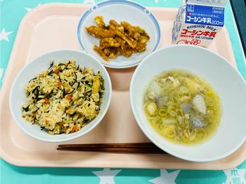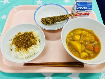 かみかみデー 牛乳・ごはん・青のりじゃこふりかけ・にぎすの石垣揚げ・みそ肉じゃが きょうは、かみかみデーです。 よく噛んで食べると、歯やあごがじょうぶになるだけでなく、食べ過ぎを防いだり、食べ物の消化が良くなったりと、さまざまな良いことがあります。 きょうは、かみごたえのある食べ物(じゃこ、にぎす)や、カルシウムの豊富な食べ物(ごま)を取り入れました。 教室では、「にぎす」の漢字クイズをしました。 |