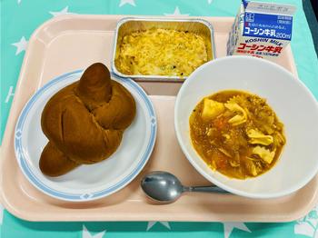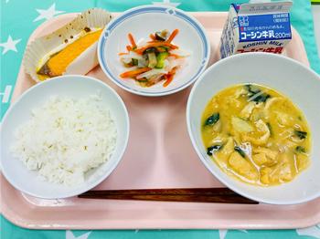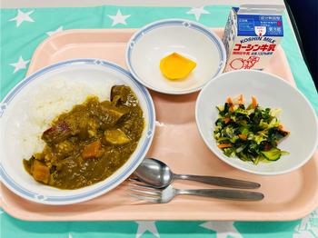 都市農業の日 牛乳・地場産野菜入りカレーライス・海藻サラダ 柚子入りドレッシング・果物(柿) 11月2日は「都市農業の日」です。「都市農業」とは、人口が多い都市部で行われている農業のことをいいます。 きょうは、東京都内からとどいた農作物(さといも、さつまいも、バターナッツかぼちゃ)を使って、カレーライスを作りました。おいしさを引き出すために、それぞれ素揚げしてから、カレーの仕上げに加えました。 教室では、動画で都市農業についての学習もしました。生産者を身近に感じ、感謝の気持ちをもって食べるきっかけになれば、うれしく思います。 |