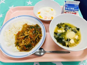 給食で世界を旅しよう♪大韓民国 牛乳・プルコギ丼・トック入りスープ・フルーツのヨーグルトかけ きょうは、日本のすぐ近くにある国、大韓民国の料理「プルコギ」を作りました。 韓国語で「プル」は火、「コギ」は肉を表します。給食室でたっぷりの肉と野菜を炒めて、特製のたれで味付けをしました。 また、スープには韓国のおもち「トック」を入れました。 教室では、韓国の食具についてのクイズをしました。 |