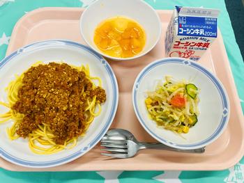 給食開始 牛乳・スパゲッティミートソース・コーンサラダ・フルーツポンチ きょうから新学期の給食が始まりました。 春休みの間、給食室は普段手の届かないところを隅々まで清掃したり、設備の点検を行ったりして、新年度に向けての準備を行いました。 今日のミートソースは、肉と野菜を炒めた後、じっくりと煮込むことで、まろやかな味に仕上げています。 給食時間には、児童の皆さんの笑顔をたくさん見ることができ、うれしく思いました。 今年度も、給食運営へのご協力をよろしくお願いいたします。 |
