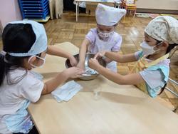10月6日(月)は中秋の名月です。お月見を前に、年長すみれ組が「お月見だんご」を作りました。だんご粉に水を混ぜてこね、1つ1つ丁寧に丸めました。子どもたちだけで全学年分を作りました。途中、年中さくら組は年長すみれ組がだんごを作っている様子を見にきて、応援をしてくれました。年少ちゅうりっぷ組も「おだんごを作ってくれているんだ」と期待でいっぱいの様子でした。