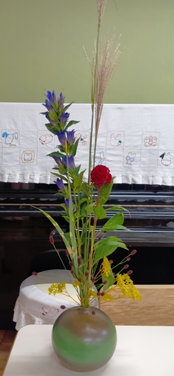 年中さくら組は、アジサイ、スターチス、ヒペリカムを生けました。