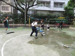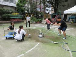 運動会の会場となる湯島園舎の園庭では、子どもたちが思い切り走ったり踊ったりすることができるよう、子どもたちの降園後、教職員が力を合わせてポリッシャーやデッキブラシを使って人工芝にたまった泥を洗い流しています。