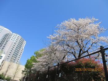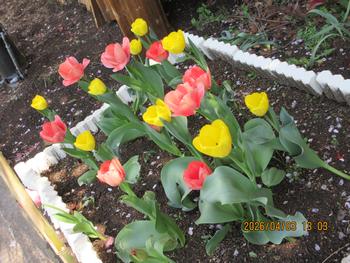 フラワーロードの桜は今日が満開。昨年度の6年が植えたチューリップもおそらく今日が盛り。入学式までもってほしいものです。