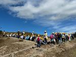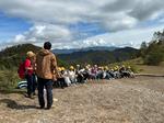 飯盛山頂上近くの広場で弁当を食べた後、クラスごとに頂上に登りました。頂上から向かいの山に向かってみんな揃って「ヤッホ」と声を出して、山彦が返ってくるのを楽しみました。
