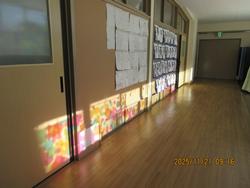 2年の共同作品です。体育館入口の6年3組教室の前に展示されています。窓から陽が差し込む10時ころまでの限定の世界です。