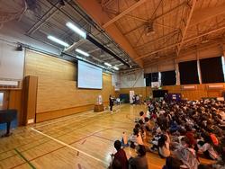 代表委員の児童があいさつをした後、各学年が学習発表会の見所を動画や寸劇などで紹介しました。