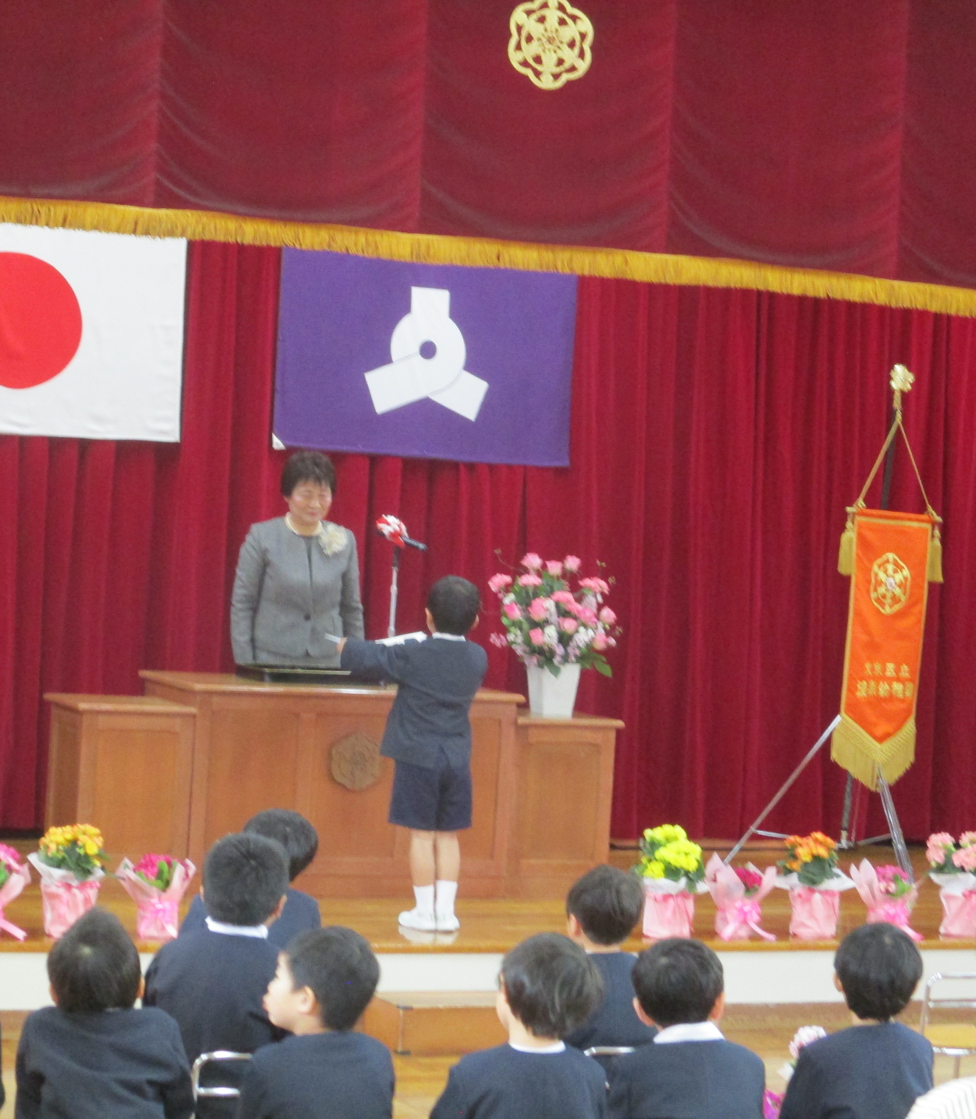 保護者の方に見守られながら、あお組一人一人が園長先生から修了証書を受け取りました。幼稚園で楽しかったこと、頑張ったことを振り返り、お別れの言葉を言ったり、歌を歌ったりし、自分たちの成長を感じながら式に臨んでいました。式の後には、もも組がお祝いの花束を渡したり、花道をつくったりして、園のみんなで門出をお祝いしました。