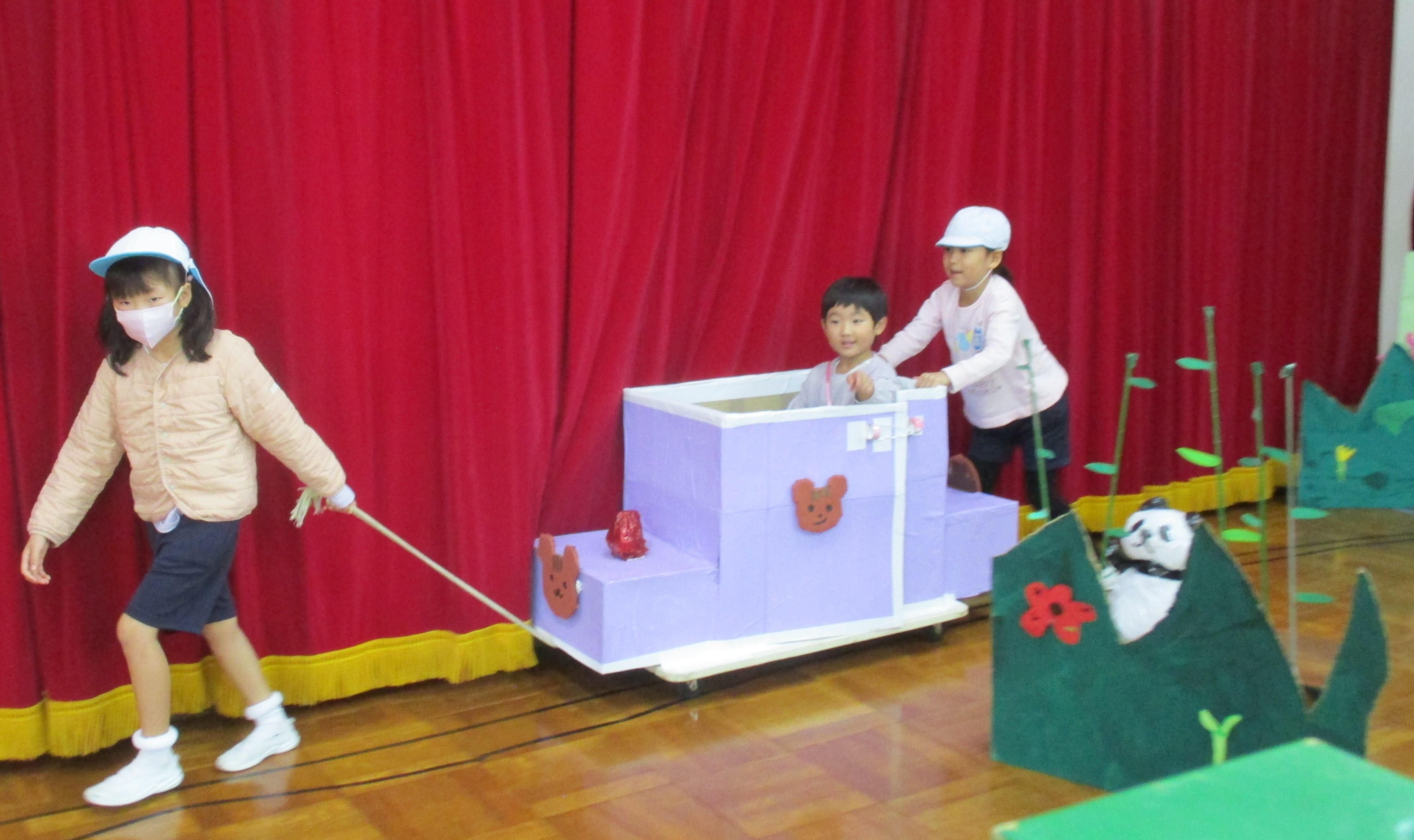 年少もも組には秘密で作っていたため、招待されたもも組はビックリ。「あお組さんが作ったの?」「本当に乗れるんだって、すごいね!」と驚きながら、あお組の遊園地を楽しんでいました。