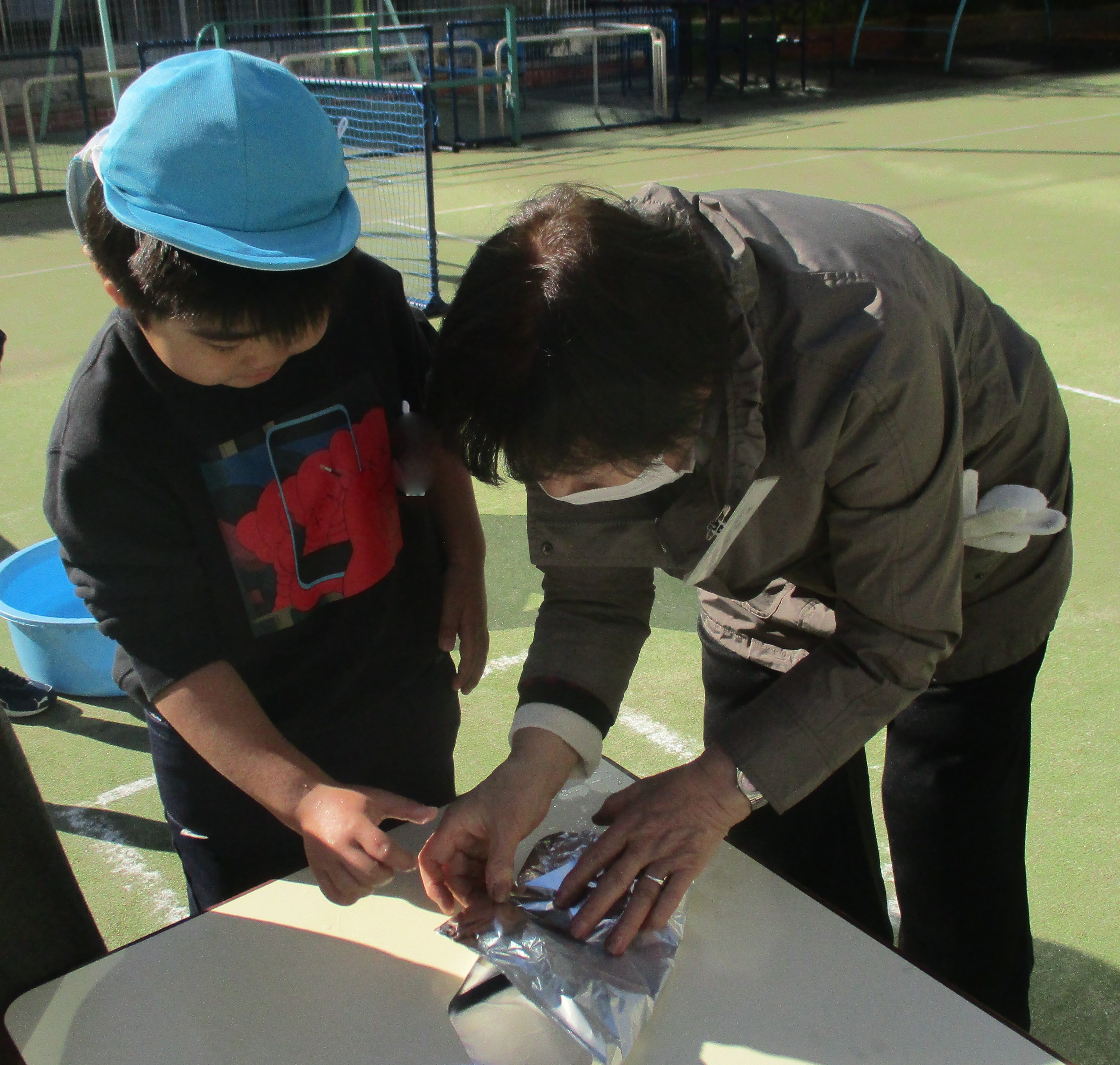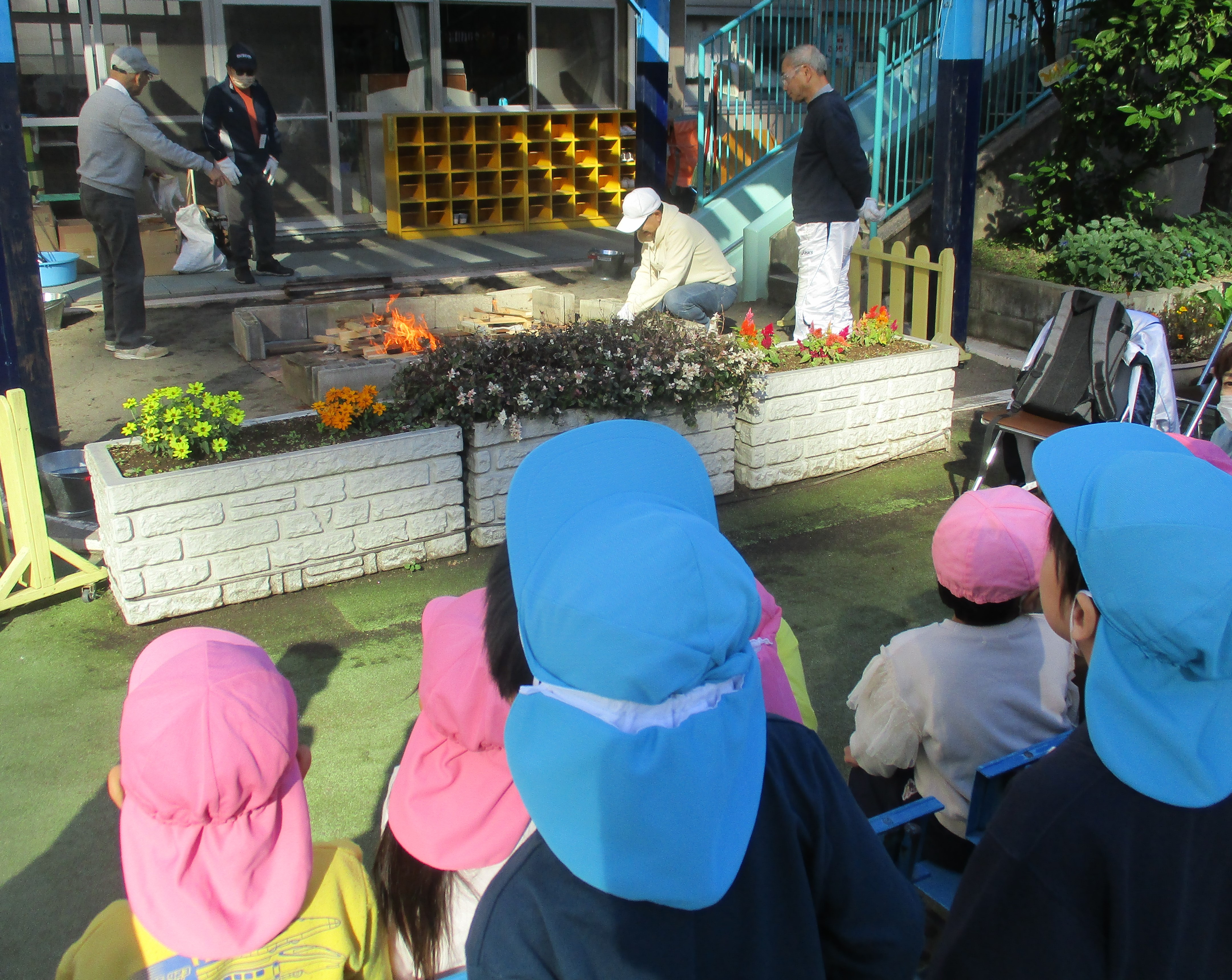 12日(水)地域の後楽クラブの方々に来ていただき、年長あお組が収穫したサツマイモを焼き芋にしました。