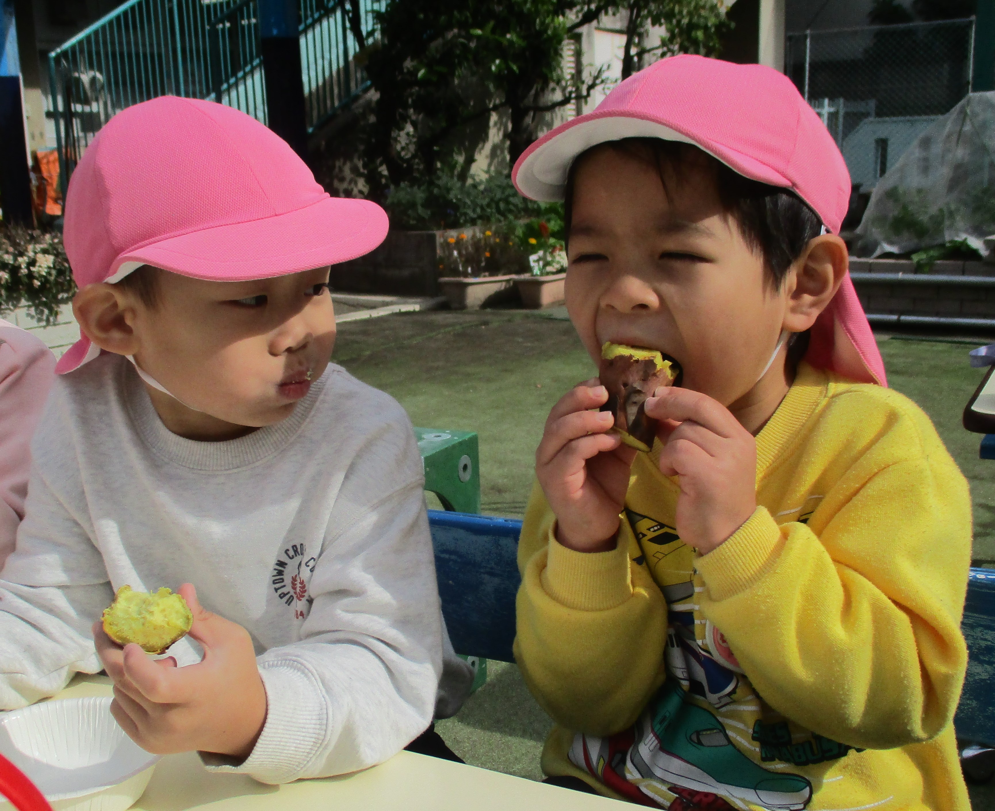できあがったホクホクの焼き芋は、園庭で食べました。