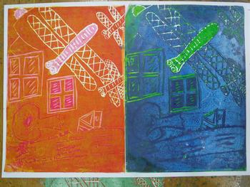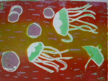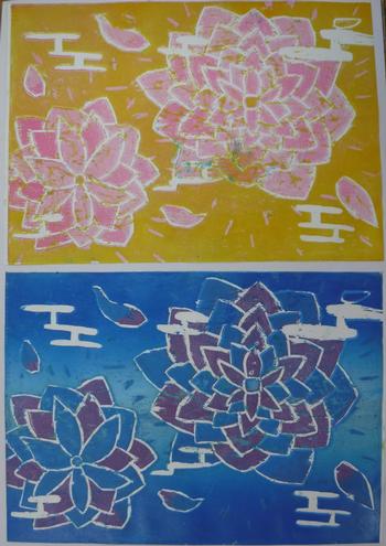 5年生は2学期、彫り進み版画という新しい技法に挑戦しました。一つの版を掘り進むことで多色刷りをしました。