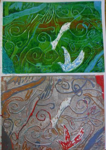 色分けのイメージをして版木を彫っていく児童もいれば、偶然に生まれた色の重なりからどんどん発想していく児童もいました。